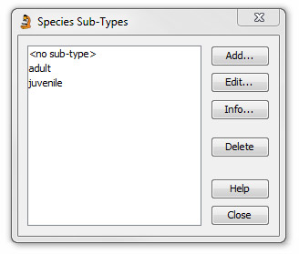 You can record occurrences of sub-divisions of a species in your database. For example, you may wish to distinguish between adult and juvenile forms of the same species, or between complete and incomplete specimens. You can create as many of these species sub-types as you need.